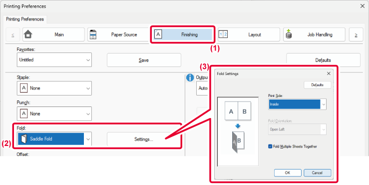 Multiple sheets are collectively folded in the center. When a saddle stitch finisher (large stacker) is installed, one or multiple sheets can be selected. |