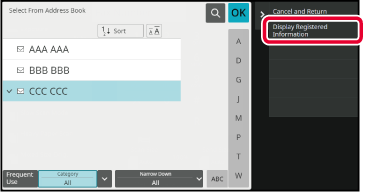 In the contact list, tap the "Contacts" that includes the address you want to add to the "Group", and tap [Display Registered Information] on the action panel.