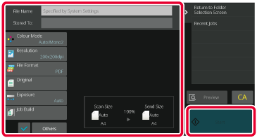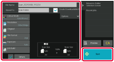 Place the original in the document feeder tray of the automatic document feeder, or on the document glass.Check the file name and save location, and tap keys for any settings you want to select.