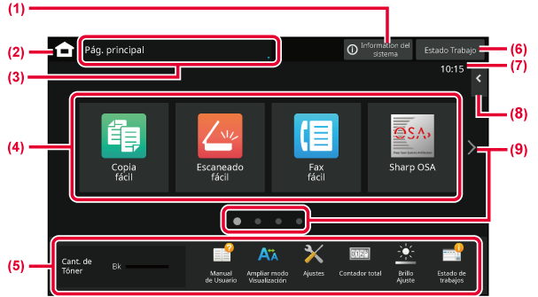 de inicio en el panel táctil. La pantalla de inicio muestra las teclas