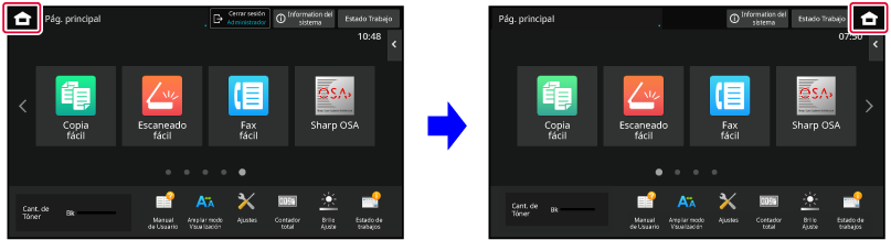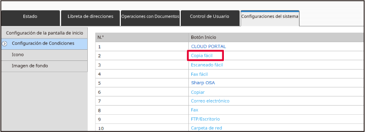 Toque [Configuraciones del sistema] → [Configuración de la pantalla de inicio] y después toque la tecla [Posición del botón de inicio].