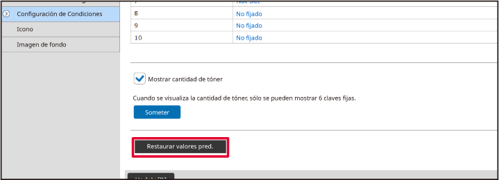 Haga clic en [Configuración de Condiciones] y después haga clic en el botón [Volver a los Predeterminados].