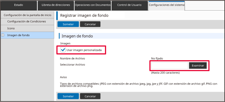Haga clic en el botón [Examinar] y seleccione la imagen que desee enviar.Cuando haya terminado de configurar los ajustes, haga clic en el botón [Someter].