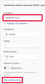 Seleccione el controlador de impresora de la máquina y haga clic en el botón [Más ajustes].