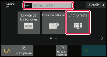 Pulse la tecla [Entr. Directa] o [Número de Fax] para introducir el número de fax de destino.