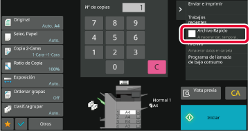 Coloque el documento original en la bandeja del alimentador de documentos automático o sobre el cristal de exposición.Cambie a modo normal y pulse [Archivo Rápido] en el panel