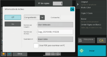 Coloque el documento original en la bandeja del alimentador de documentos automático o sobre el cristal de exposición.Cambie a modo normal y pulse [Archivo] en el panel de acciones para especificar la información del archivo.