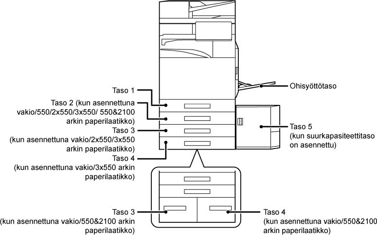 *1 Kun asennettuna on alusta/550 arkin paperilaatikko/alusta/2x550 arkin paperilaatikko/alusta/3x550 arkin paperilaatikko/alusta/550&2100 arkin paperilaatikko.