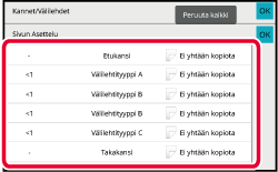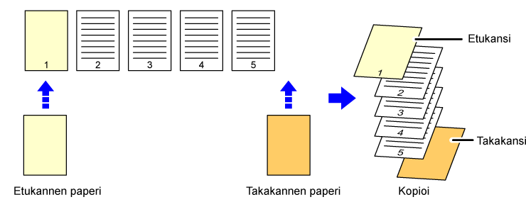 ![]() Lisää etukannen kopioiden alkuun ja tekee alkuperäisen 5. ja 6. sivusta takakannen kaksipuolisena kopiona. |