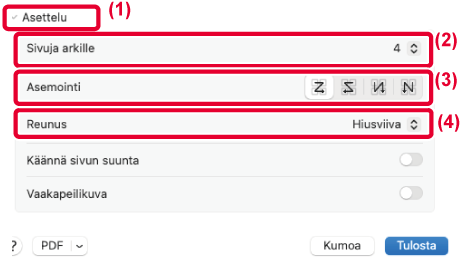 [4 otosta] (4 sivua arkilla), saavutetaan seuraavat tulostuksen tulokset