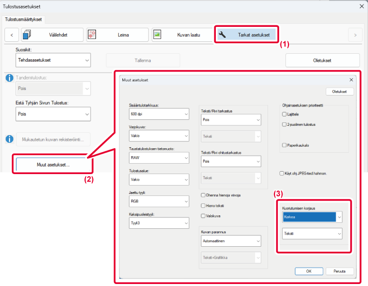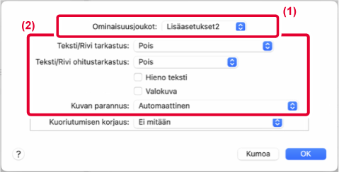 Voit tehdä tekstin ja grafiikan reunoista pehmeämpiä tai terävämpiä. Autom.: Suorita optimaalinen kuvan parannus. Pois: Kuvan parannusta ei käytetä. Terävä: Kuvan parannusta käytetään terävästi. Pehmeä: Kuvan parannusta käytetään pehmeästi. |