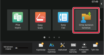 Kun kosketusnäytössä ei näy [Oman kansion tulostus] -näppäintä, lisää [Oman kansion tulostus] -näppäin aloitusnäytöllä. Tarkat tiedot näppäimen lisäämisestä, katso ” PIKANÄPPÄINTEN LISÄÄMINEN”.