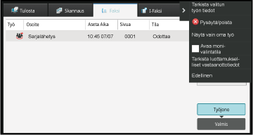 Vahvista faksityön tila koskettamalla tilanäyttöä ja valitsemalla faksin.