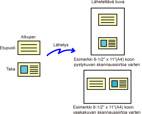 Skannauksen ja lähetyksen päätteeksi kuuluu merkkiääni.Lähetä kortin etu- ja takapuoli yhtenä sivuna