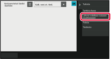 Kosketa sen vastaanotetun tiedon näppäintä, jonka haluat lähettää edelleen ja kosketa [Lähetä edelleen toiseen osoitteeseen].