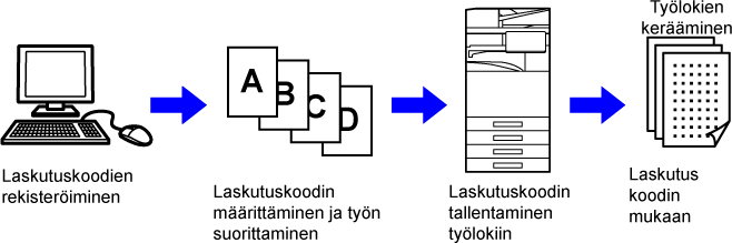 Käytetään suoritettujen tulostus- ja lähettämistöiden tulosten luokitteluun tehokkaan hallinnan käyttämiseksi. Voit esimerkiksi määrittää asiakkaan mukaan koodin ja kerätä kustannustiedot asiakaskohtaisesti työlokeista. Koodiesimerkki: yrityksen A lasku |