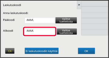 Kun näytetään laskutuskoodin syöttöikkuna, kosketa ruutua kohdassa [Pääkoodi] ja syötä sitten pääkoodi.