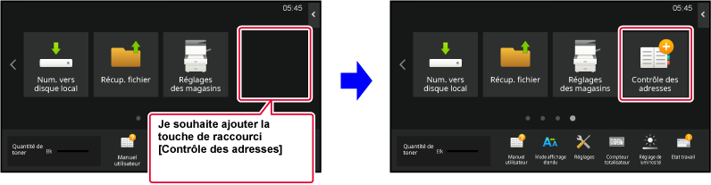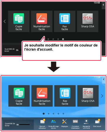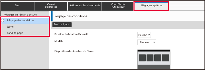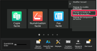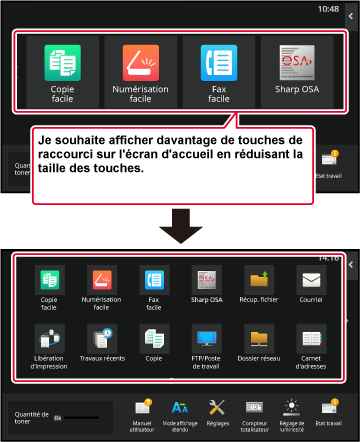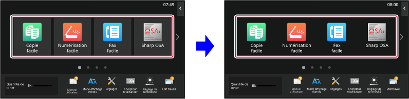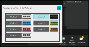 Les réglages sont enregistrés dans la machine et ils sont appliqués.Plusieurs modèles de disposition de l'écran