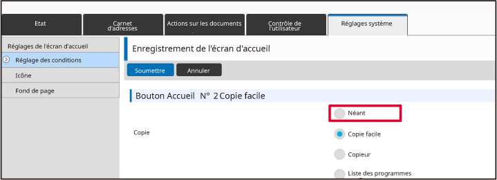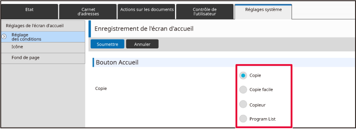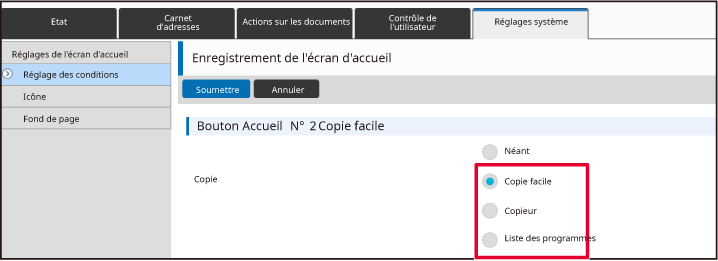 Lorsque vous cliquez sur le bouton [Soumettre], l'écran [Enregistrement de l'écran d'accueil] se ferme.Lorsque vous avez fini de configurer les réglages, cliquez sur le bouton [Soumettre].