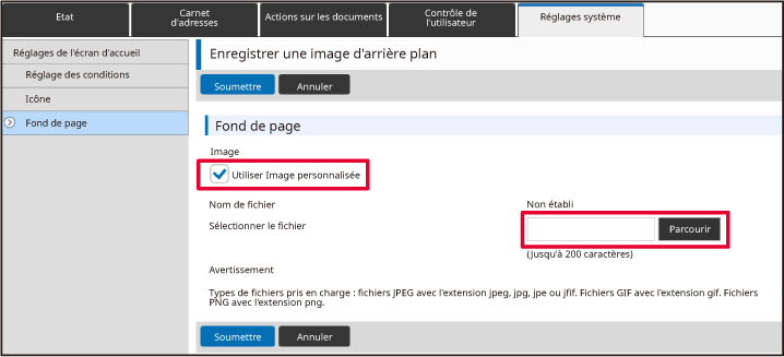 Cliquez sur le bouton [Parcourir] et sélectionnez l'image à soumettre.Lorsque vous avez fini de configurer les réglages, cliquez sur le bouton [Soumettre].