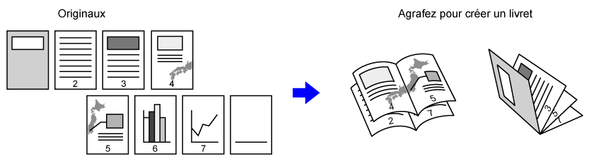 Placez l'original sur le magasin du chargeur automatique de documents ou sur la vitre d'exposition.Appuyez sur la touche [Autres] puis sur la touche [Livret] ou appuyez sur la touche [Tri agrafage] puis sur la touche [Piqûre à cheval].