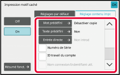 Pour spécifier les réglages d'impression, vous pouvez sélectionner un des textes prédéfinis ou utiliser le clavier logiciel. Vous pouvez également imprimer le numéro de série et l'ID de travail de compte.