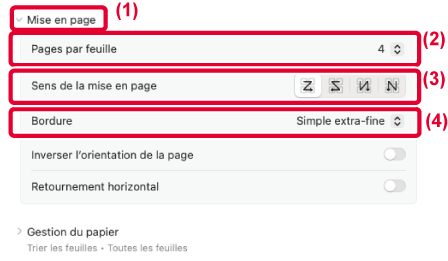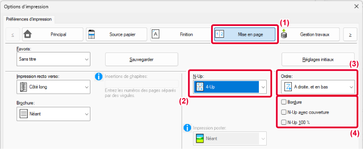 ou [4-Up] (4 pages par feuille) est sélectionnée, les résultats d'impression