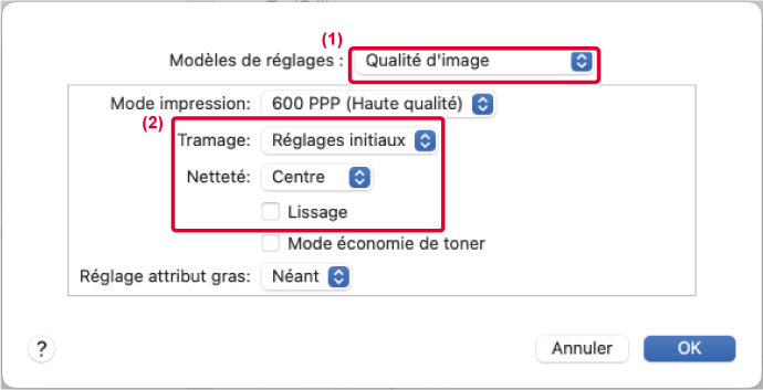 Les techniques d'amélioration de la résolution (RET) permettent de lisser les contours des images. Ce réglage traite l'image pour augmenter la résolution et lisser les bords irréguliers de l'image. |