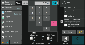 Appuyez sur la touche [Entrée directe] ou [Numéro de fax] pour saisir le numéro de fax de destination.