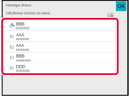 Dans l'écran initial ou l'écran du carnet d'adresses, appuyez sur la touche [Historique d'envoi] du panneau de commande.