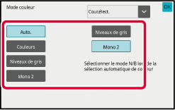 Appuyez sur la touche [Niveaux de gris] ou [Mono 2] pour régler le mode N/B en sélection couleur automatique.