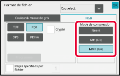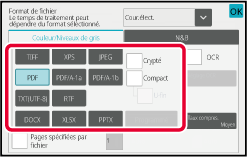 *1 Lorsque PDF (y compris chiffré et compression élevée) est sélectionné pour le format de fichier, la compression Flate peut être utilisée pour réduire le format de fichier.