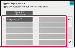 Selon la fonction enregistrée dans le programme, placez l'original sur le plateau du chargeur automatique de documents ou sur la vitre d'exposition.Appuyez sur la touche du programme souhaité.