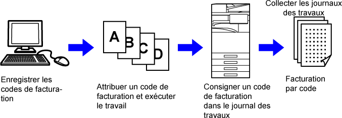 Utilisé pour classifier les résultats des travaux d'impression et d'envoi exécutés pour permettre une gestion efficace. Par exemple, vous pouvez attribuer un code par client et collecter les informations concernant les coûts par client à partir des journaux des travaux. Exemple de code : Édition de l'entreprise A |