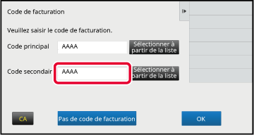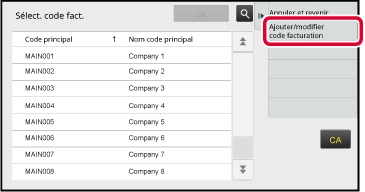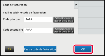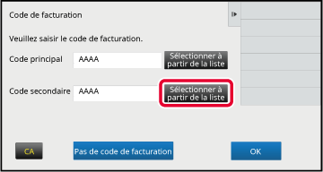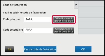 pour terminer la procédure d'enregistrement.Lorsque la fenêtre de saisie du code de facturation s'affiche, appuyez sur la touche [Sélectionner à partir de la liste] du code principal.