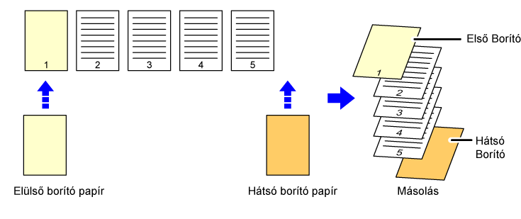 ![]() Beilleszt egy előlapot a másolatok elé, és a hatodik eredeti oldalt egyoldalasan felmásolja a hátlapra. Az ötödik eredeti oldalról egyoldalas másolatot készít. |