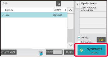 Több fájl is kiválasztható. Beikszelt jelölőnégyzet mutatja a fájlokat, amelyekre rákoppintott. A mappában található összes fájl kijelöléséhez koppintson az [Összes kiválasztása] gombra. A kiválasztott fájlok törléséhez koppintson a [Törlés] gombra. Válassza ki az egyik fájlt, és a nyomtatási adatok előnézeti képének ellenőrzéséhez koppintson a "Kép ellenőrzése" lehetőségre a Műveleti panelen. Az előnézeti képernyő működése megegyezik a dokumentumtárolásban lévő képek ellenőrzésének módszerével. Lásd: " KÉPFÁJL ELLENŐRZÉSE". A Műveleti panelen a "Részletes adatok megtekintése" lehetőségre is koppinthat a részletes információk, például a fájl nyomtatási méretének ellenőrzéséhez. Ha ki akar nyomtatni egy fájlt, folytassa a következő lépéssel.