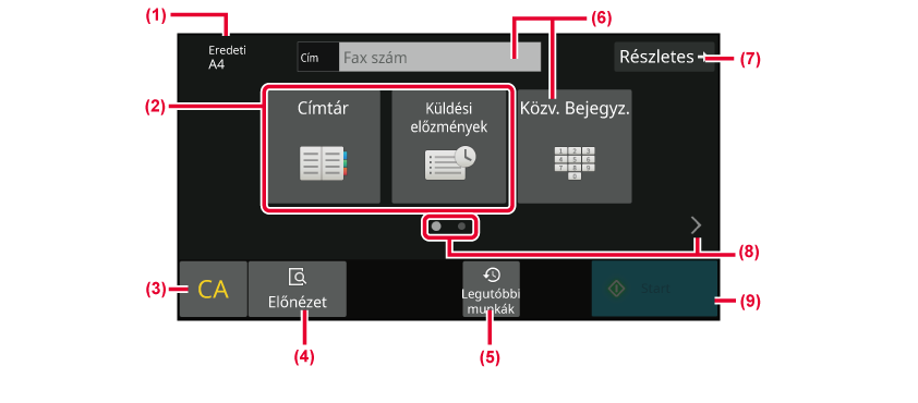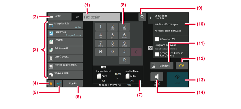 - A fax módban elérhető funkciókat jeleníti meg.