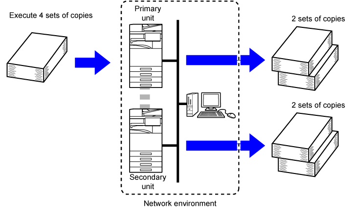 Opptil 9999 kopier (sett) kan velges. Det spesifiserte antallet kopier deles mellom primærenheten og sekundærenheten. Hvis antallet kopier utgjør et oddetall, lager primærenheten flere kopier enn sekundærenheten.
