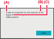 På bekreftelsesskjermen vises antall skannede originalark i (A), antall skannede sider i (B) og antall kopier med unntak av tomme sider i (C).