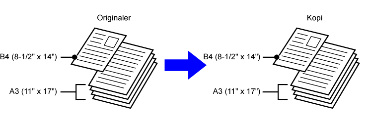 Bruk denne innstillingen når originalene har 2 ulike størrelsestyper og ikke har sider av samme lengde. Denne innstillingen kan kun brukes for følgende kombinasjoner av størrelser: • A3 og B4 • A3 og B5 • B4 og A5 • A4 og B5 • B4 og A4R • B4 og A5 • B5 og A4R • B5 og A5 • 11" x 17" og 8-1/2" x 14" • 11" x 17" og 8-1/2" x 13" • 11" x 17" og 5-1/2" x 8-1/2"