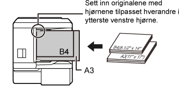 Bruk denne innstillingen for originaler som har 2 ulike størrelsestyper, men som har sider av samme lengde. Originalene skal legges inn i dokumentmaterskuffen med sidene av samme lengde tilpasset til venstre. • A3 og A4 • B4 og B5 • A4R og A5 • 11" x 17" og 8-1/2" x 11" • 8-1/2" x 14" og 8-1/2" x 11"R • 8-1/2" x 14" og 5-1/2" x 8-1/2" • 8-1/2" x 13" og 8-1/2" x 11"R • 8-1/2" x 13" og 5-1/2" x 8-1/2" • 8-1/2" x 11"R og 5-1/2" x 8-1/2" |