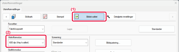 Velg denne modusen for å skrive ut fargebilder med høyere oppløsning og for å skrive ut fine linjer tydeligere. |