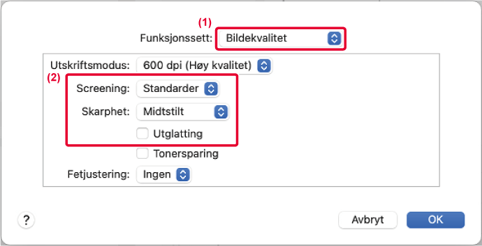 Teknikker for forbedret oppløsning (RET) brukes til å glatte ut bildekonturer. Med denne innstillingen behandles bildet for å øke oppløsningen og glatte ut ujevne bildekanter. |