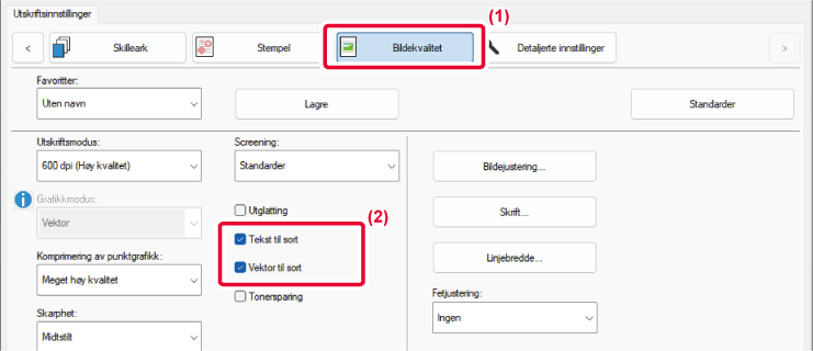 skrives tekst og linjer med svake farger ut i svart. Denne funksjonen