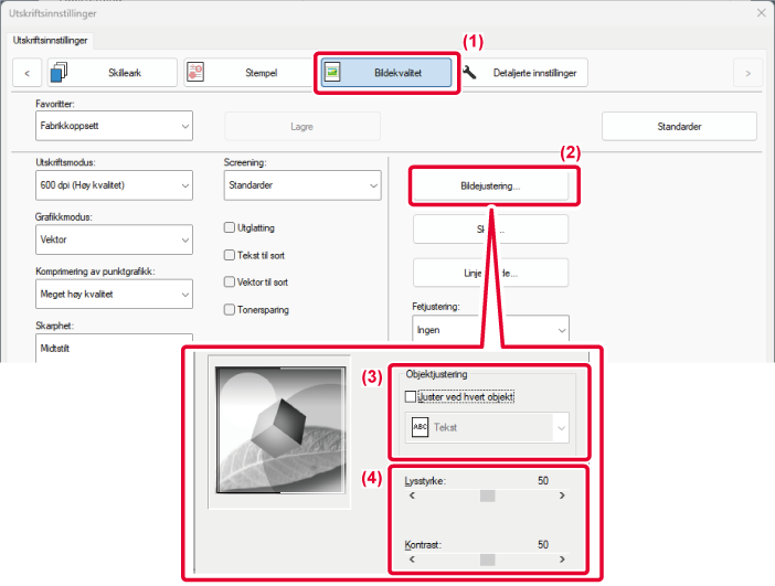 lysstyrke og kontrast i utskriftsinnstillingene når et fotografi