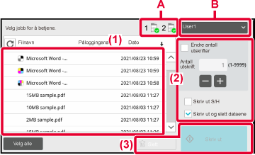 utskriftsjobbene som tilhører den påloggede brukeren.