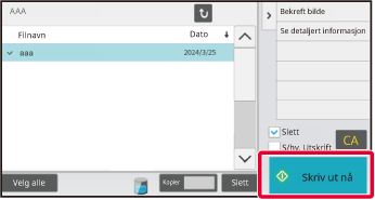 Flere filer kan velges. Filen du har trykket på, blir merket med en hake. For å velge alle filene i en mappe, trykk på [Velg alle]-tasten. For å slette de valgte filene, trykk på [Slett]-tasten. Velg én av filene, og trykk på "Bekreft bilde" i handlingspanelet for å sjekke forhåndsvisningen av utskriftsdataene. Forhåndsvisningsskjermen fungerer på samme måte som når du kontrollerer bilder ved dokumentarkivering. Se "KONTROLL AV BILDEFILER". Du kan også trykke på "Se detaljert informasjon" i handlingspanelet for å sjekke detaljert informasjon, for eksempel filens utskriftsstørrelse. Når du vil skrive ut en fil, fortsetter du til neste trinn.