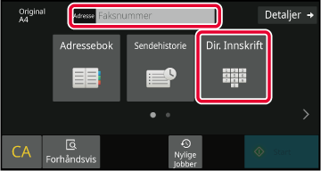 Trykk på [Dir. Innskrift]-tasten eller [Faksnummer] for å angi et destinasjonsfaksnummer