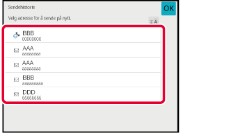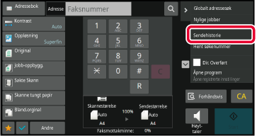 Fra startskjermen eller adresseboken, trykker du [Sendehistorie] på handlingspanelet.